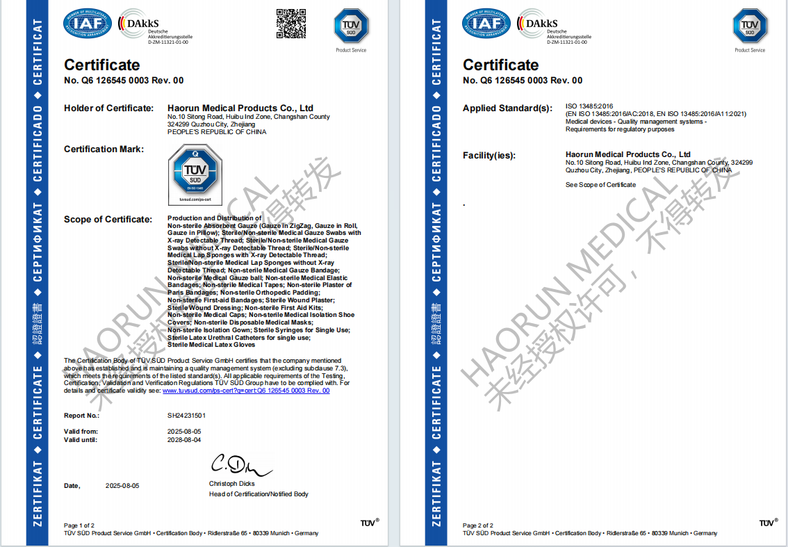 Kalitatea areagotzeko, gure kalitatearen eskuliburua eta prozeduraren dokumentuak 2023ko irailean argitaratzea osatu genuen. Honen arabera, gure kalitatea kudeatzeko sistemaren dokumentuak 2024ko urtarrilean hobetu genituen, MDR-ri lotutako edukia gehituz. TUV Sud auditoriaren lehen etapa gainditu genuen 2025eko apirilaren 10ean eta, ondoren, bigarren etapa. Azkenean, aurtengo abuztuan gure ziurtagiriaren zenbakia eskuragarri zegoen jakinarazitako organoaren sisteman ikusteko, Haorun Medikuen Kalitatearen Kudeaketa Sisteman aurrera egin eta konpainiaren garapenerako oinarria indartuta. Gure kontsumitzaile medikoek (gasa, gasa erroiluak, gaza benda, etab.) Bezeroei mundu osoko produktuen kalitate eta zerbitzuarekin eskaintzen diete.