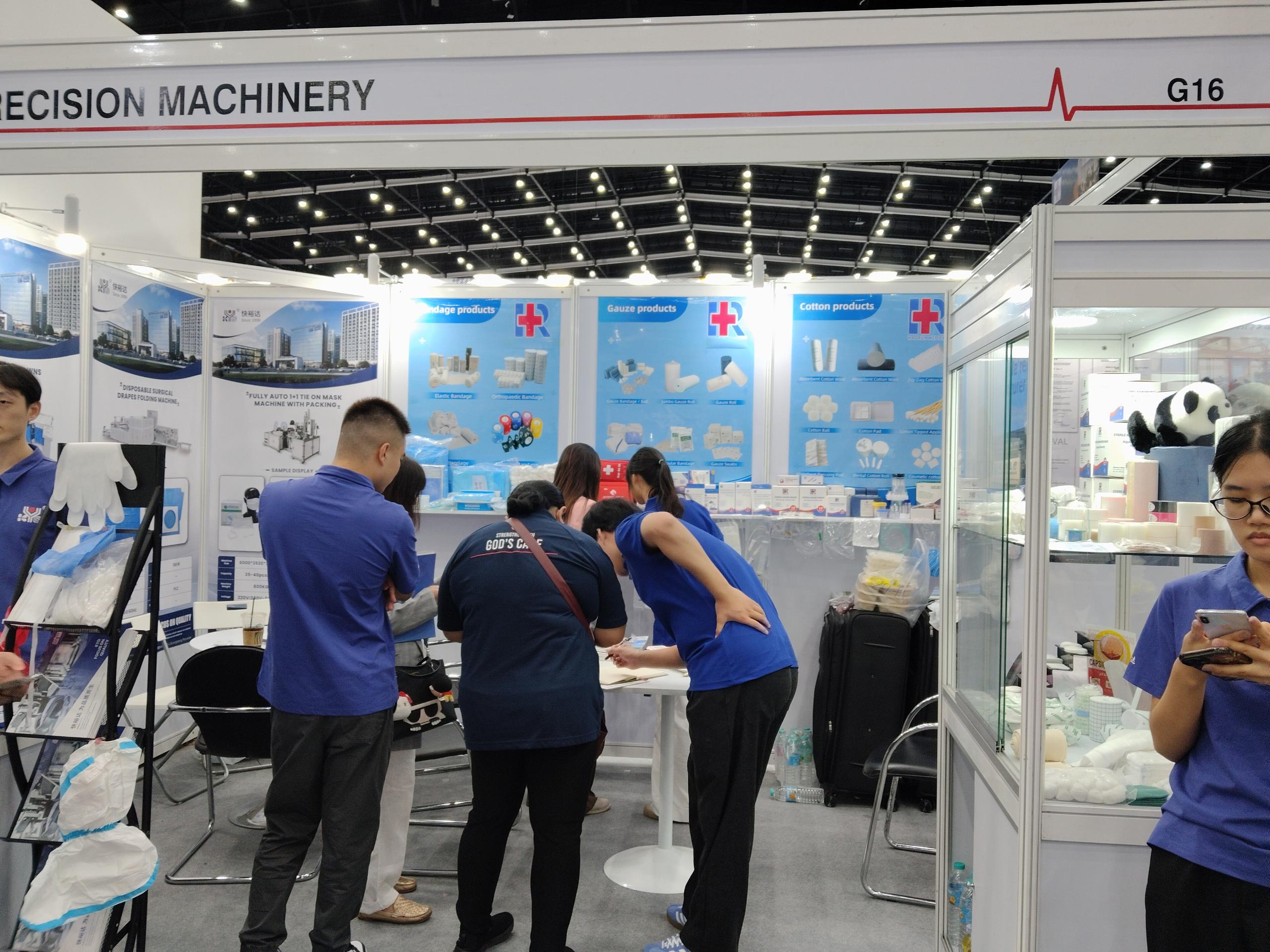 Erakusketa gunean, HAORUN MEDICAL-en G16 standa oso deigarria da. Lekuko argazkietan ikus daitekeen bezala, eta inguruan hainbat produktu medikoren kartelak daude, hainbat mediku hornigai estaltzen dituztenak, hala nola bendak eta kotoizko zapiak. Langileak, uniforme urdinez jantzita, lanpetuta ari dira kontsultara etortzen den publiko profesionalarekin komunikatzen. Batzuk arreta handiz aurkezten dizkiote produktuen ezaugarriak eta abantailak ikusleei, eta beste batzuk arreta handiz jasotzen ari dira bezeroen beharrak eta iritziak. Bertako giroa beroa eta profesionala da.